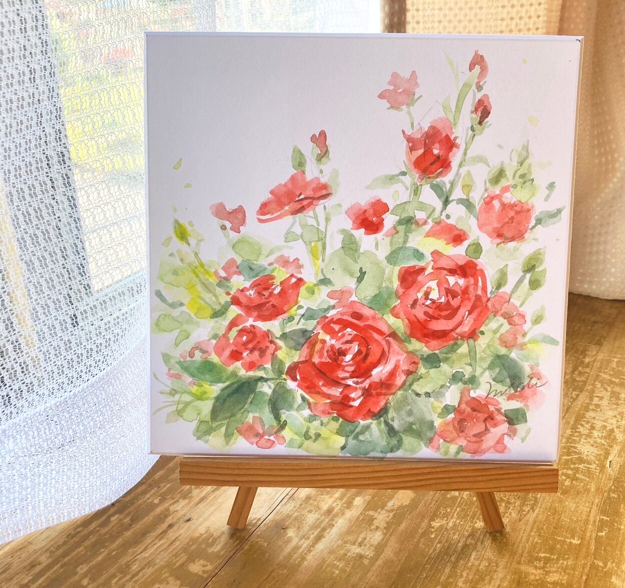 額装していませんが強い厚紙なのでそのまま立て掛けて飾っていただけます。